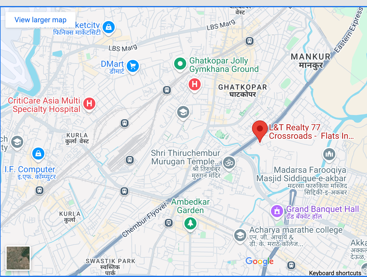 L&T Realty presents a magnificent landmark in the heart of MMR at Ghatkopar East, which will elevate your lifestyle. Defined by comfort, style and exclusivity, L&T Realty 77 Crossroads is exceptional in every sense. Connected to prime destinations like BKC, Powai, Navi Mumbai etc. you can reach anywhere in Mumbai in minutes. This extraordinary gated community features stylish and functional 1 BHK in Ghatkopar as well as 2 BHK flats/apartments at the location. Filled with world-class amenities, this exclusive address is a gateway to a lifestyle that you truly deserve!